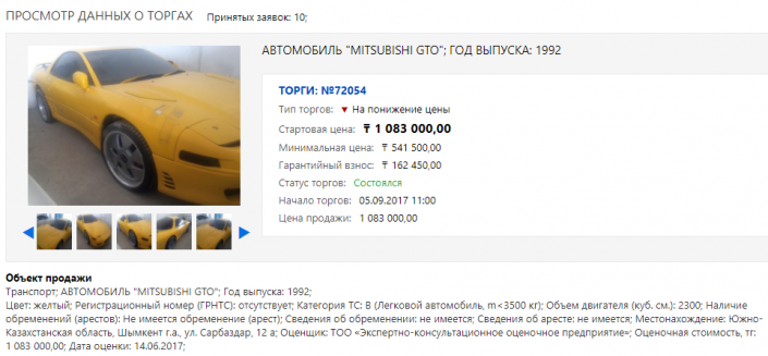 Внедорожник GMC ранее выставлялся на торги по цене 6 527 000 тенге. Торги по нему также состоялись, автомобиль продан за 3 907 956 тенге.