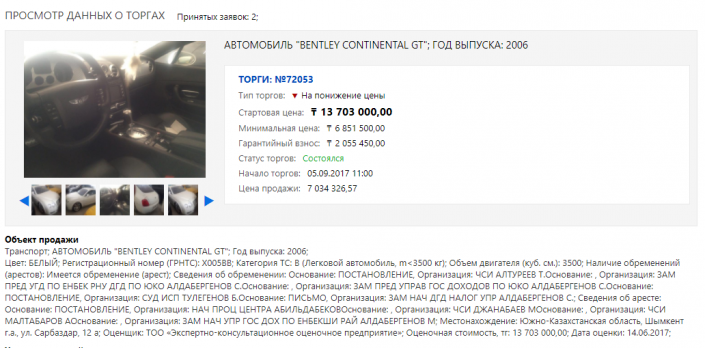 Ранее на торги выставили несколько машин Тохтара Тулешова, конфискованные решением суда: Rolls-Royce 2005 года, Bentley 2006 года, Mitsubishi GT 1992 года и внедорожник GMC 2006 года.