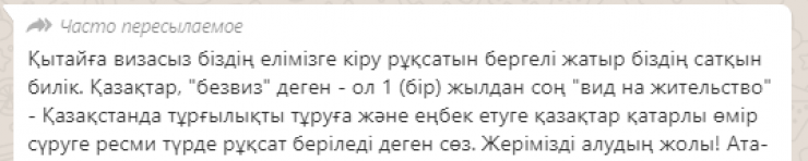 Казахстанцы рассылают в мессенджере WhatsApp сообщение, в котором говорится, что в республике вводится безвизовый режим для граждан Китая, передает Tengrinews.kz со ссылкой на Stopfake.kz.