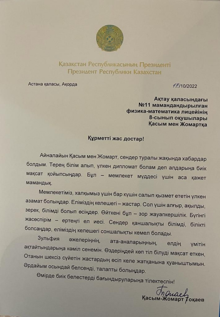 В своем письме Глава государства пожелал мальчикам стать гражданами, преданно служащими стране и достигающими больших высот. Токаев одобрил их желание стать дипломатами и отметил, что это не только нужная для государства профессия, но и большая ответственность. Также, по словам Президента, сегодняшняя молодежь - это будущие хозяева страны.