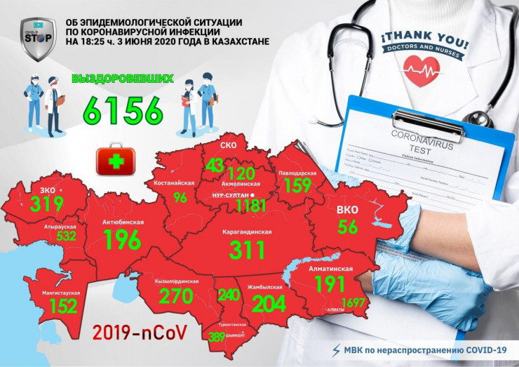 Число выздоровевших от коронавируса в Казахстане выросло до 6156, передает  Tengrinews.kz со ссылкой на Межведомственную комиссию по нераспространению болезни.