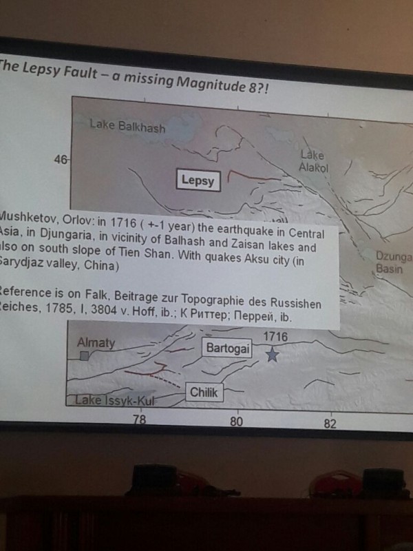 Он продемонстрировал собравшимся так называемый "Лепсинский разлом" недалеко от поселка Лепсы и гор Джунгарского Алатау. Сдвиг тектонических плит, по данным ученых, в этом случае составляет около десяти метров. "Когда произошло землетрясение, изменился канал реки Лепсы. Исследовав отложения в старом русле, нам удалось выяснить, что землетрясение произошло около 400 лет назад. Удивительно, но мы не видим никаких исторических записей о событии. Потенциально речь может идти о землетрясении 1716 года. В оригинальной исторической записи описаны разрушения в районе озер Балхаш и Зайсан, а также в городе Аксу в Китае. Но я не думаю, что это что-то, что мы можем сказать с абсолютной уверенностью", - пояснил ученый.