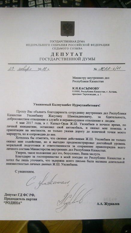 Также в Сети опубликована копия письма депутата Госдумы к главе МВД РК Калмуханбету Касымову с просьбой объявить благодарность Жасулану Уксикбаеву "за бдительность, добросовестное отношение к службе и неравнодушное отношение к людям".