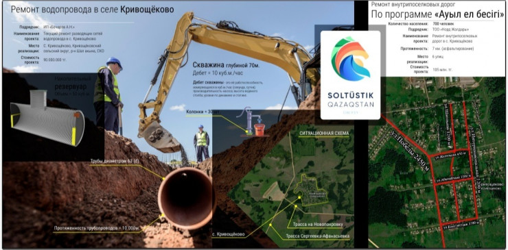 Введен мини-элеватор, сейчас идет расширение. В селе появится молочная ферма на 2,5 миллиарда тенге, это 30 постоянных рабочих мест. Внедрят систему капельного орошения на площади 5 тысяч гектаров. На 20 процентов повышена зарплата работникам.