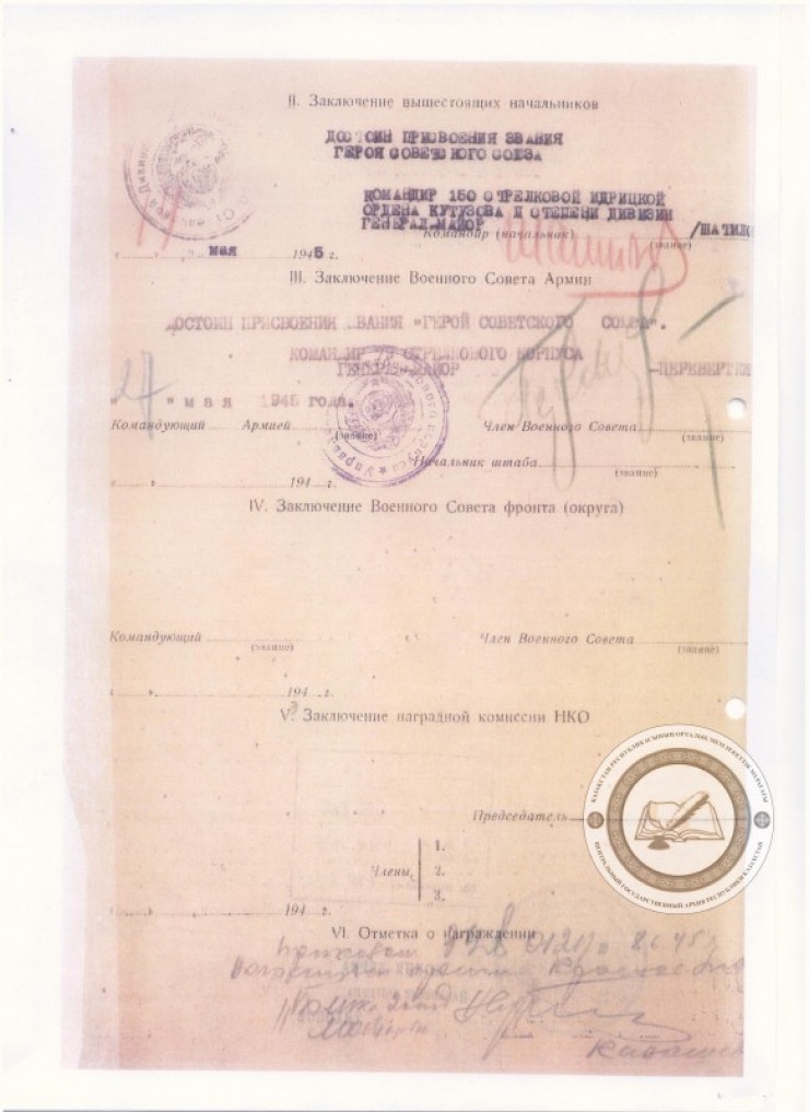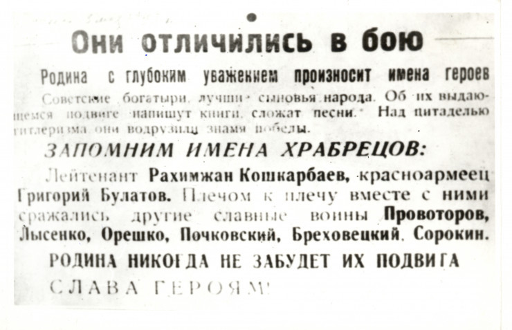 *Согласно журналу боевых действий 150-й стрелковой дивизии, в 14 часов 25 минут 30 апреля 1945 года лейтенант Рахымжан Кошкарбаев и рядовой Григорий Булатов "по-пластунски подползли к центральной части здания". 360 метров открытого пространства под шквальным огнем Кошкарбаев и Булатов ползли почти восемь часов.