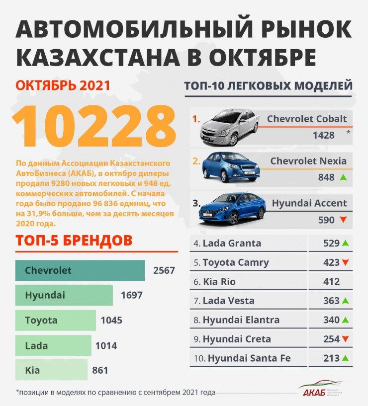 По данным Ассоциации казахстанского автобизнеса (АКАБ), в октябре 2021 года продажи новых автомобилей в Казахстане по сравнению с октябрем 2020 года увеличились на 3,64 процента - продано 9 280 новых легковых и 948 коммерческих автомобилей.