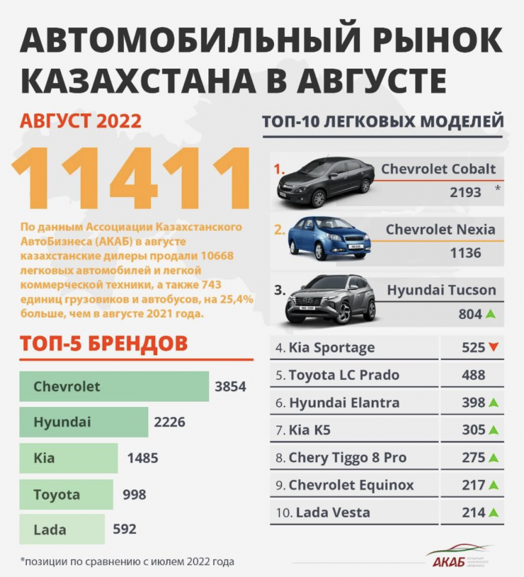 Добавим, что отчет АКАБ по продажам в августе показывает интерес казахстанцев и к другим моделям бренда Сhevrolet. Наблюдается увеличение спроса на Chevrolet Spark (+60 процентов к июлю 2022 года), который является лидером по продажам в своем сегменте (от 5 390 000 тенге), а также имеют стабильные продажи динамичный Chevrolet Malibu и коммерческий автомобиль Сhevrolet Damas.