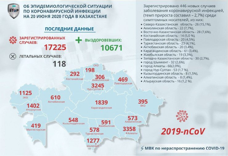 За прошедшие сутки (20 июня) в Казахстане выявлено 446 заболевших коронавирусной инфекцией, передает корреспондент Tengrinews.kz.