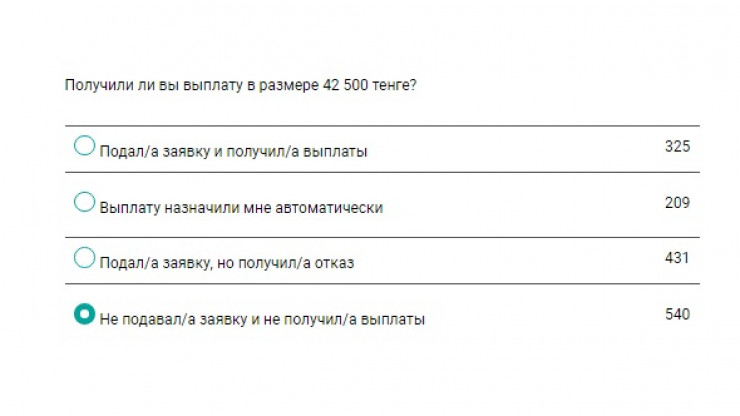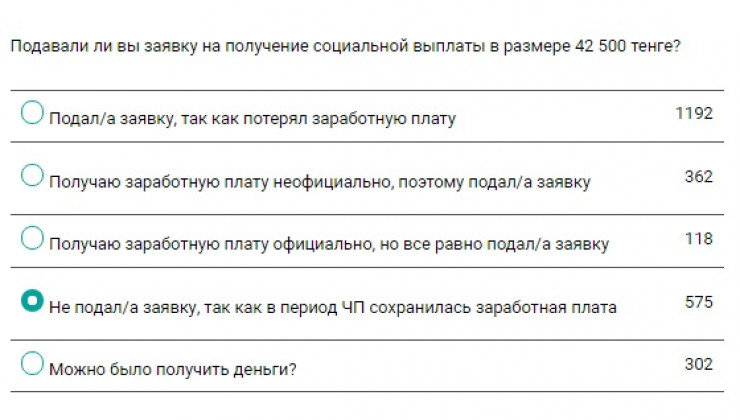 Стоит отметить, что казахстанцы, не лишавшиеся доходов, тоже подавали заявки на получение выплат. Так, например, 326 участников опроса подали заявки на получение выплат, работая неофициально. Еще 118 работающих официально, видимо, понадеялись, что проверка заявок не будет тщательной, и также отправили заявки на получение выплат.