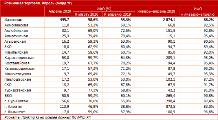 За апрель магазины, базары и прочие розничные точки продаж по Казахстану наторговали на 495,7 миллиарда тенге, что на 40,9 процента меньше, чем в апреле прошлого года, передает Tengrinews.kz со ссылкой на Ranking.kz.