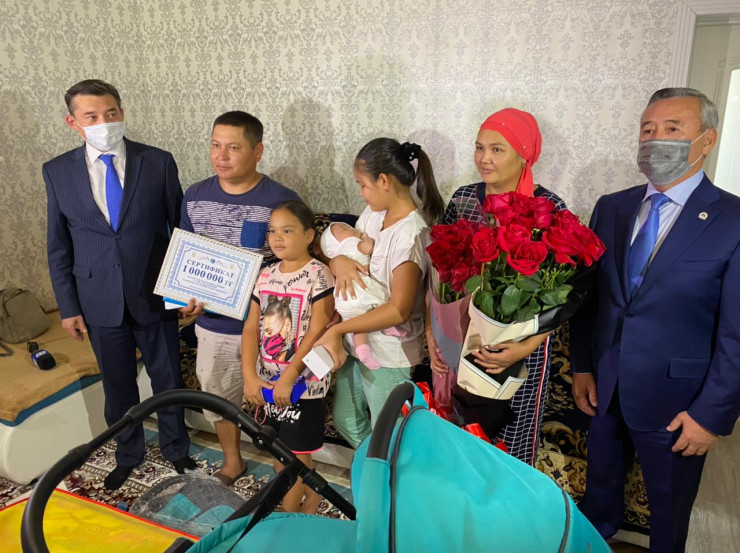 Заместитель акима Алматинской области Арслан Дандыбаев приехал в дом новорожденной, чтобы лично поздравить родителей с пополнением. В честь знаменательного события он подарил семье сертификат на сумму один миллион тенге. Также для малышки привезли детскую коляску, набор по уходу за младенцем, корзину фруктов и другие презенты.
