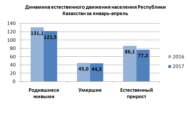 В результате обработки сведений, содержащихся в записях актов гражданского состояния, представленных органами РАГС, число родившихся за январь-апрель 2017 года составило 121,5 тысячи человек, что на 7,4 процента меньше, чем за соответствующий период 2016 года. Общий коэффициент рождаемости на 1000 человек составил 20,49 родившихся.