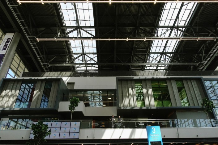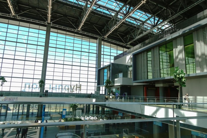 Зал ожидания выполнен в светлых тонах с преобладанием зеленого и голубого. Некоторые стены выполнены полностью из стекла, что визуально расширяет пространство.