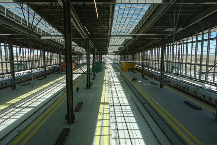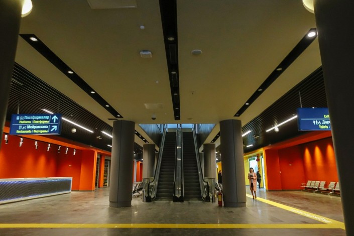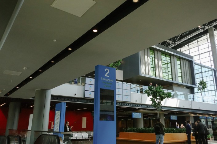Поезда прибывают на третий этаж здания, там производятся посадка и высадка пассажиров. Перрон вокзала крытый, таким образом пассажиры будут защищены от любых погодных условий.
