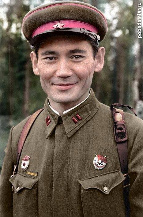 "Отреставрированное в цвете фото легендарного Бауыржана Момышулы. Работа Olga Shirnina", - написал Карин.