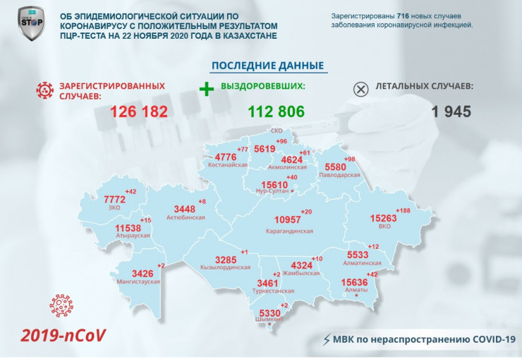 За прошедшие сутки (по данным на 22 ноября) в Казахстане зарегистрировано 716 новых случаев заболевания коронавирусной инфекцией, передает Tengrinews.kz со ссылкой на МВК по нераспространению COVID-19.