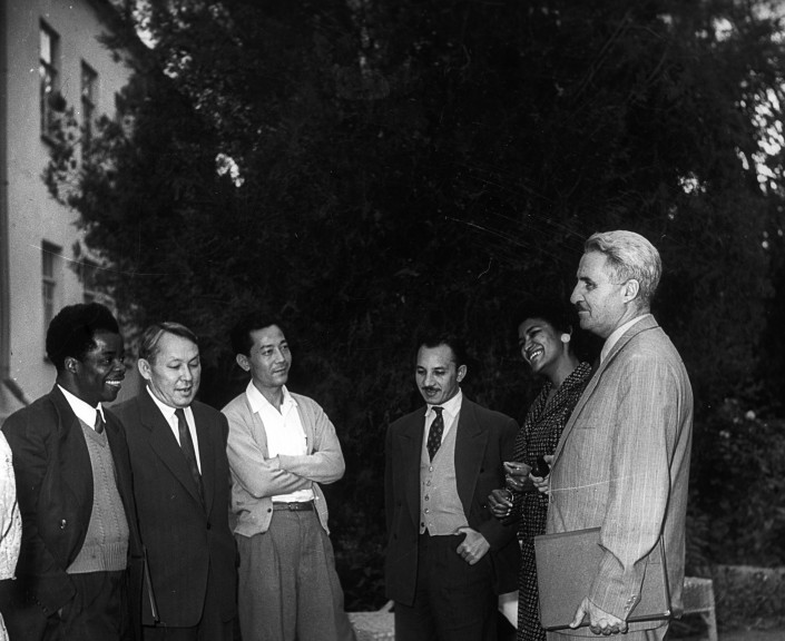 Киносценарист Константин Симонов (справа крайний), среди участников конференции писателей стран Азии и Африки. Писатель Габит Мусрепов (слева второй). Ташкент, 1958 год.