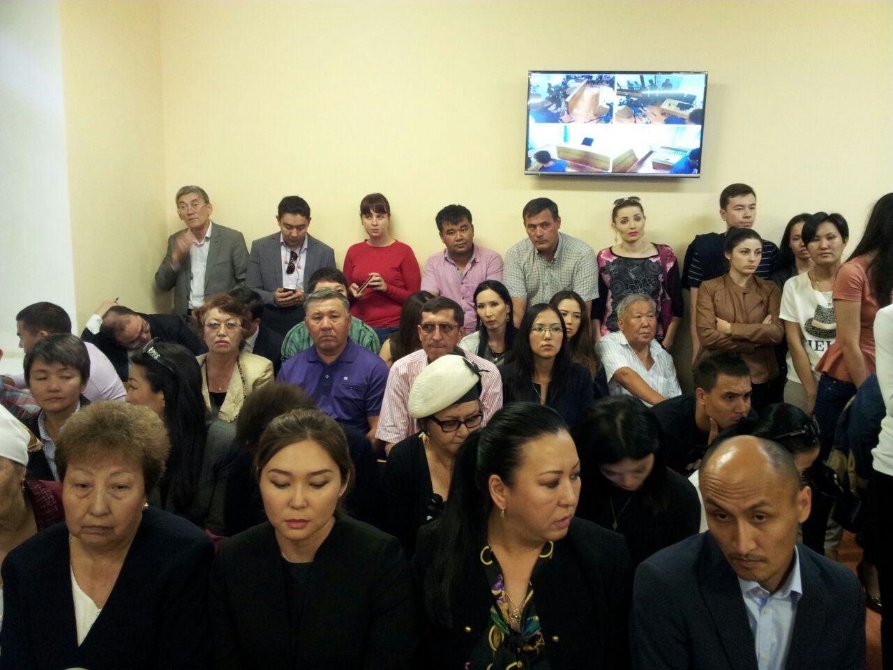 По всей видимости, ожидая наплыва людей, желающих присутствовать на судебных слушаниях, было принято решение выделить самый большой зал городского суда. Однако и он не вместил всех пришедших. Судья Ербол Рахимбеков, рассматривающий данное дело, был вынужден удалить из зала тех, кому не досталось сидячих мест. В суде сегодня можно было увидеть всех участников нашумевшей истории. Также в зале суда было немало представителей СМИ.
