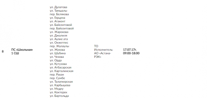 Как сообщается на странице в Facebook АО "Астана -РЭК", 18 июля этого года для установки приборов учета в частном секторе запланированы отключения электроэнергии в период с 09.00 часов по 18.00 в Алматинском районе Астаны - по улице Алимжанова, Карагандинской, Толстого и Сейфуллина, Панфилова и Нажимеденова. Полное отключение электроэнергии в это же время запланировано по улице № 86 (район "Чубары").