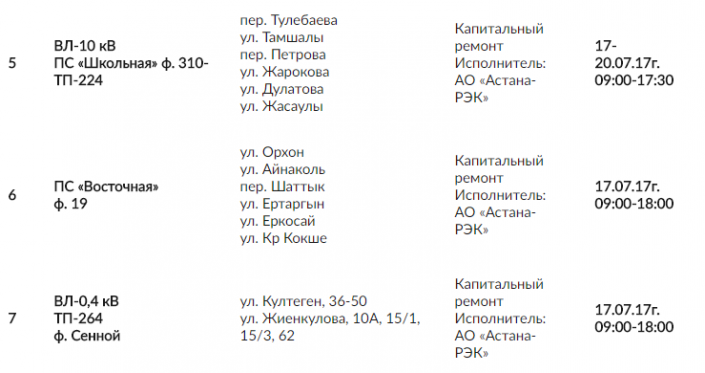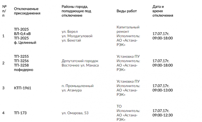 Кроме того, 17 июля до 18.00 подача электроэнергии будет прекращена в поселке Ильинка, на улицах Батыр Баян, Сырым батыр, Исатай батыра и по улице Кожаберген Жырау.