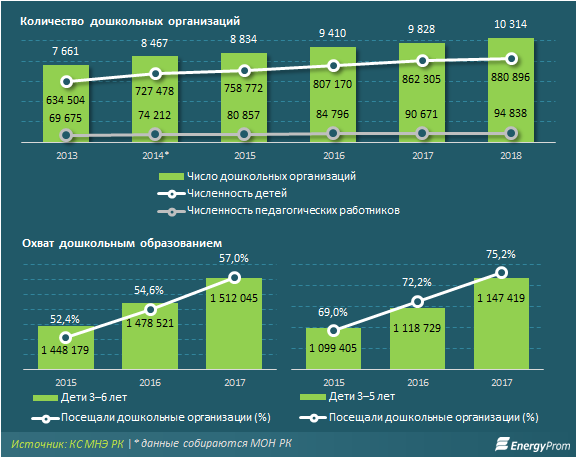 Согласно статистике, в 2017 году в Казахстане было 1,51 миллиона детей возраста от трех до шести лет. Дошкольные учреждения тогда посещали лишь 862,3 тысячи (охват - 57 процентов). Однако, по данным специалистов, в последние годы количество дошкольных организаций растет. За пять лет их число увеличилось с 7,7 тысячи до 10,3 тысячи. Численность детей выросла с 634,5 тысячи до 880,9 тысячи. Количество педагогов также увеличилось - с 69,7 тысячи до 94,8 тысячи работников.