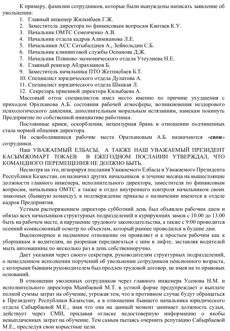 "С момента его (Айдына Оразханова. - Прим. автора) повторного прихода началось давление на работников, только за месяц уволены примерно 40 сотрудников, и по сей день продолжается давление на работников. Стоит тяжелая рабочая атмосфера, которая вынуждает квалифицированных сотрудников покидать свои рабочие места во избежание дальнейших конфликтов с руководством. Он уже поменял их на своих людей. Мы можем быть уволены в любой момент", - рассказывает замначальника службы сбора доходов Досым Джолдыбаев.