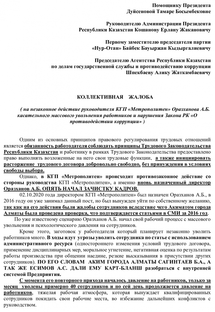 Несколько сотрудников КГП "Алматыметрополитен" написали письмо в акимат Алматы, а также в Администрацию Президента и Антикор с просьбой разобраться в сложившейся ситуации.