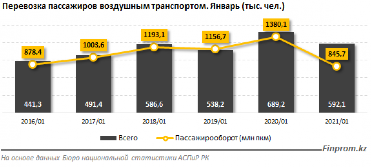 "За январь текущего года в стране перевезли 592,1 тысячи человек. Пассажирооборот сократился на 38,7 процента за год", - добавили аналитики.