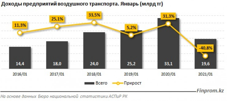 По данным аналитиков, в январе 2021 года доходы авиакомпаний страны составили 19,6 миллиарда тенге. Это на 40,8 процента меньше, чем годом ранее.  Из них 17,9 миллиарда тенге составили доходы от пассажироперевозок, 1,7 миллиарда тенге - доходы от грузоперевозок.
