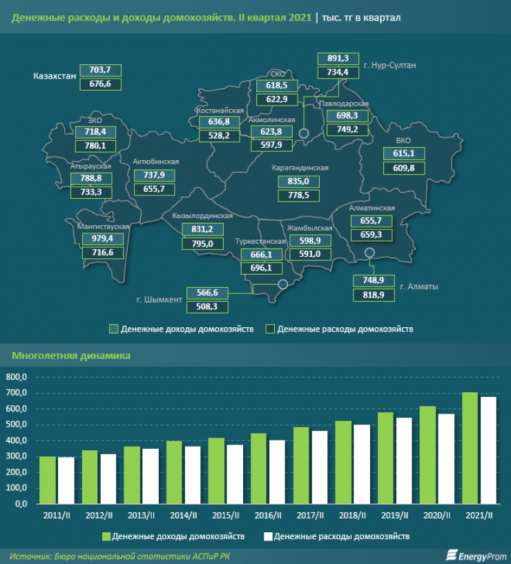Аналитики отметили, что во втором квартале 2021 года средний расход одного казахстанского домохозяйства на коммунальные услуги, содержание жилья и ремонт  составили 34,5 тысячи тенге. Это на 17,6 процента больше в денежном выражении, чем годом ранее, и на 36,3 процента выше, чем пять лет назад. При этом общие денежные расходы одного домохозяйства в этот же период составили 676,6 тысячи тенге, что на 19,5 процента больше, чем в аналогичном периоде прошлого года. Денежные доходы домохозяйств во втором квартале выросли на 13,5 процента до 703,7 тысячи тенге.