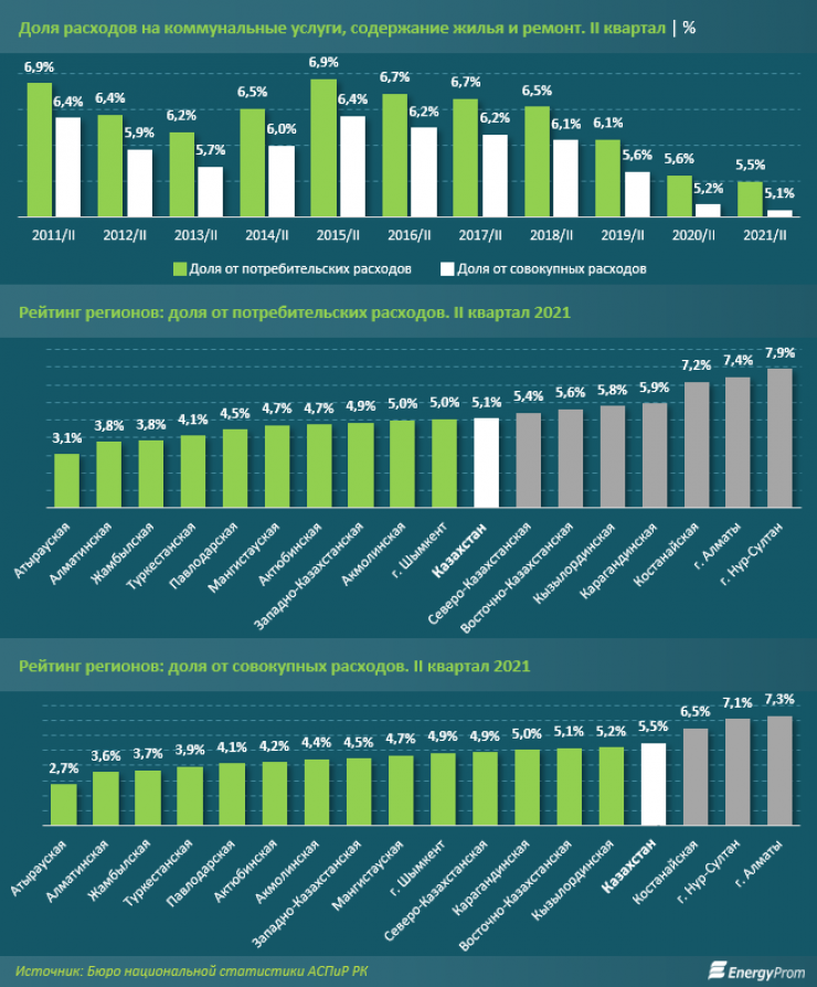 Во втором квартале 2021 года доля расходов на коммунальные услуги, содержание жилья и ремонт от потребительских расходов домохозяйств составила 5,5 процента, передает корреспондент Tengrinews.kz со ссылкой на energyprom.kz.
