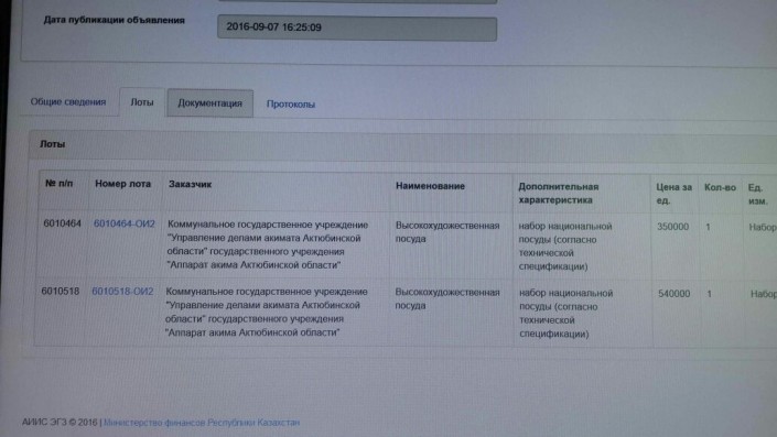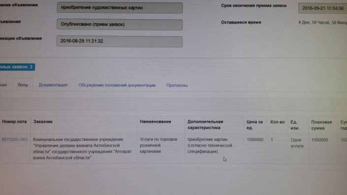 Акимат Актюбинской области разместил еще несколько лотов на открытом сайте государственных закупок. Корреспондент Tengrinews.kz, помимо кресла с позолоченными элементами, обнаружил заказ других предметов роскоши, а именно - набор "высокохудожественной посуды" стоимостью 540 тысяч тенге, художественных картин за 1,5 миллиона тенге, водопад по стеклу за 1,6 миллиона тенге, штор за 1,8 миллиона тенге.