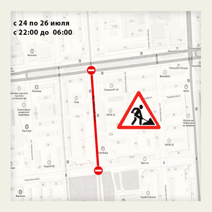 "В связи с дорожно-ремонтными работами на проспекте Абылай хана участок от улицы Маметовой до проспекта Райымбека с 24 июля 22:00 до 25 июля 06:00 и с 25 июля 22:00 до 26 июля 06:00 будет перекрыт", - сообщает пресс-служба организации.