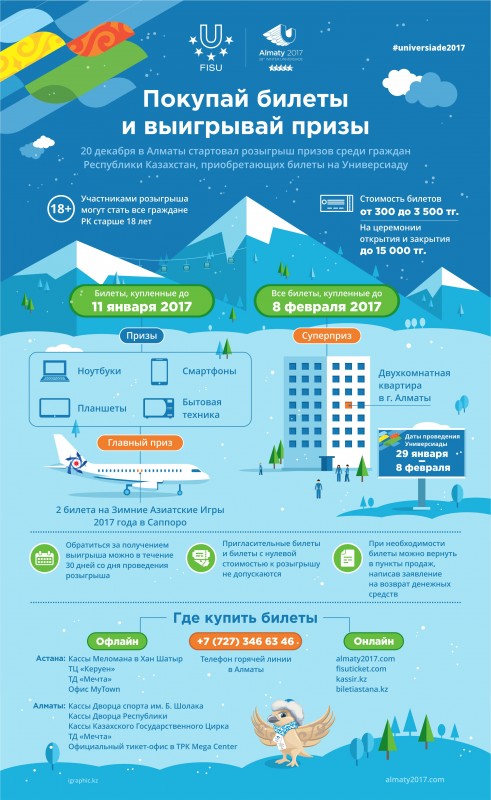 Казахстанцы, купившие билеты на Универсиаду-2017, смогут выиграть двухкомнатную квартиру и другие ценные призы, сообщает корреспондент Tengrinews.kz со ссылкой на Дирекцию по подготовке и проведению 28-й Всемирной Зимней Универсиады 2017.