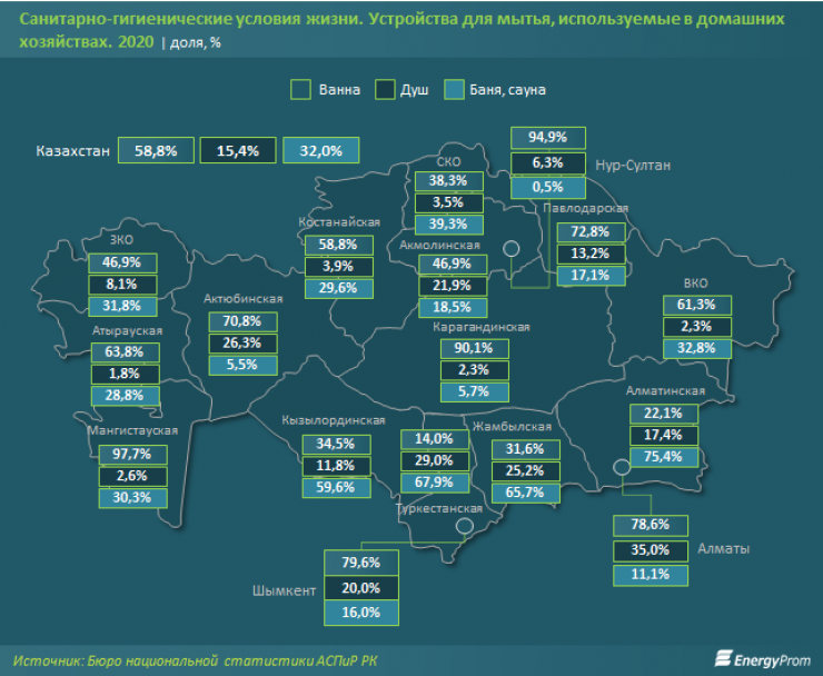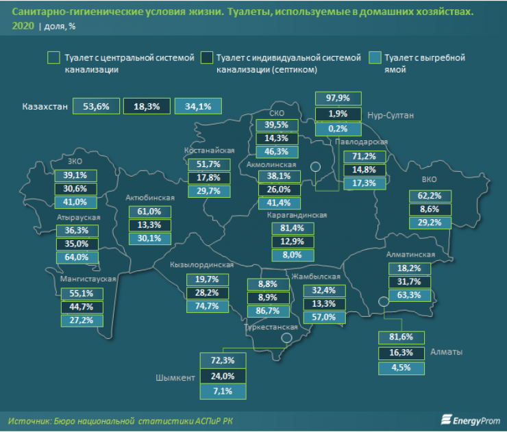 Туалетами с центральной канализацией лучше всего обеспечены домохозяйства Нур-Султана и Алматы, а также Карагандинской области. Хуже всего с туалетами с центральной канализацией обстоят дела в Туркестанской области: ими оборудованы лишь 8,8 процента домохозяйств. В тройку аутсайдеров также попали Алматинская и Кызылординская области.