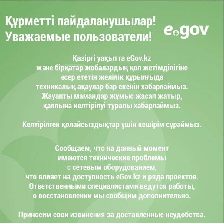 "На данный момент имеются технические проблемы с сетевым оборудованием, что влияет на доступность eGov.kz и ряда проектов. Ответственными специалистами ведутся работы. О восстановлении мы сообщим дополнительно", - сообщили в пресс-службе АО "Национальные информационные технологии" (НИТ).