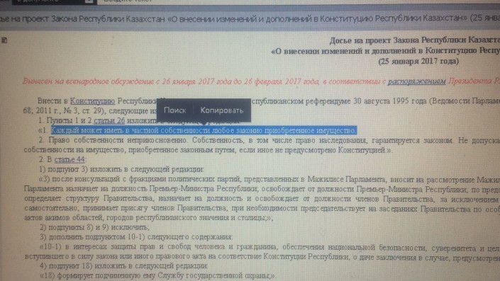 Так, в первом пункте статьи 26 сказано: "Граждане Казахстана могут иметь в частной собственности любое законно приобретенное имущество" (авторы видеоролика отнесли к имуществу и земли). В свою очередь разработчики законопроекта предлагают заменить слова "Граждане Казахстана" на слово "Каждый".