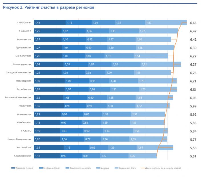 Разница в оценках счастья имеется и в соседних регионах, например, оценка уровня жизни в Туркестанской области относительно высокая (6,30), тогда как в Жамбылской области оценили уровень жизни ниже среднего по стране (5,85).