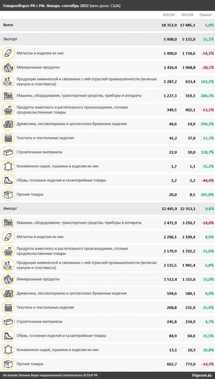 Структура импорта из России в Казахстан практически такая же, чаще всего из РФ поставлялись машины и оборудование (2,5 миллиарда долларов), металлы и изделия из них (2,3 миллиарда), продукты агропромышленного комплекса и продовольственные товары (2,2 миллиарда тенге), продукция химической промышленности и минеральные продукты.