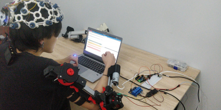 Платформа Назарбаев Университета для роботизированной нейрореабилитации после перенесенного инсульта состоит из оборудования и программного обеспечения для считывания и распознавания сигналов мозга, микроконтроллера, экзоскелета для верхних конечностей и платформы с персонализированной программой с элементами геймификации.