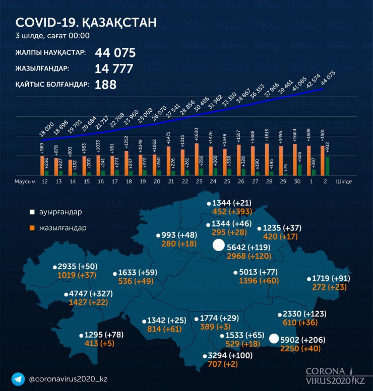 Общее число заразившихся коронавирусом выросло в Казахстане до 44 075. При этом 14 777 человек уже излечились, а 188 скончались.