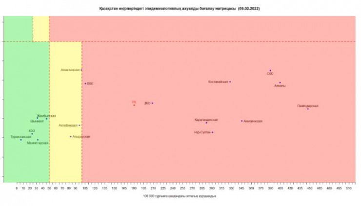 Матрица оценки эпидемиологической ситуации в регионах Казахстана на 9 февраля выглядит следующим образом:
