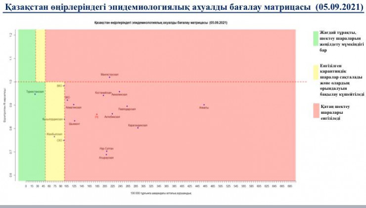 В "красной" зоне: города Нур-Султан, Алматы, Шымкент, Акмолинская, Актюбинская, Алматинская, Атырауская, Западно-Казахстанская, Карагандинская, Костанайская, Мангистауская, Павлодарская области.
