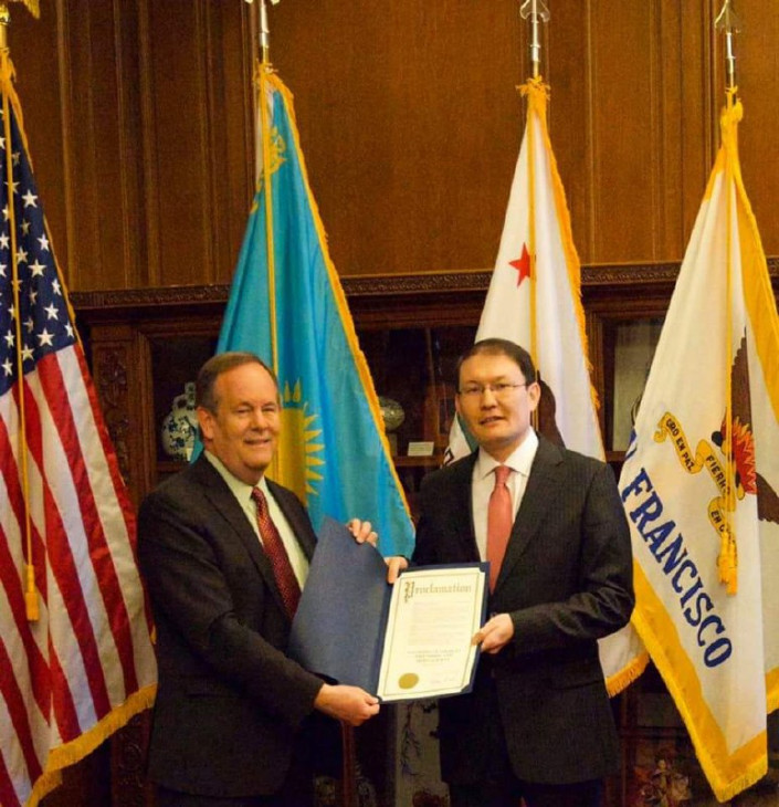 Как отметили в ведомстве, подобное мероприятие проходит впервые на западном побережье США. "В честь Дня независимости Республики Казахстан мэр города Сан-Франциско Лондон Н. Брид подписала заявление о признании 16 декабря 2019 года днем казахстанско-американской дружбы", - говорится в сообщении.
