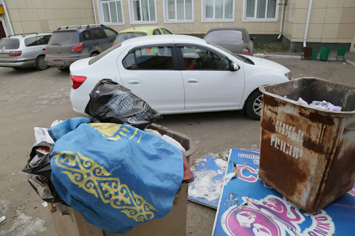 Флаг Казахстана выбросили в мусорку возле ЦОНа в Костанае Фото с сайта ng.kz.
