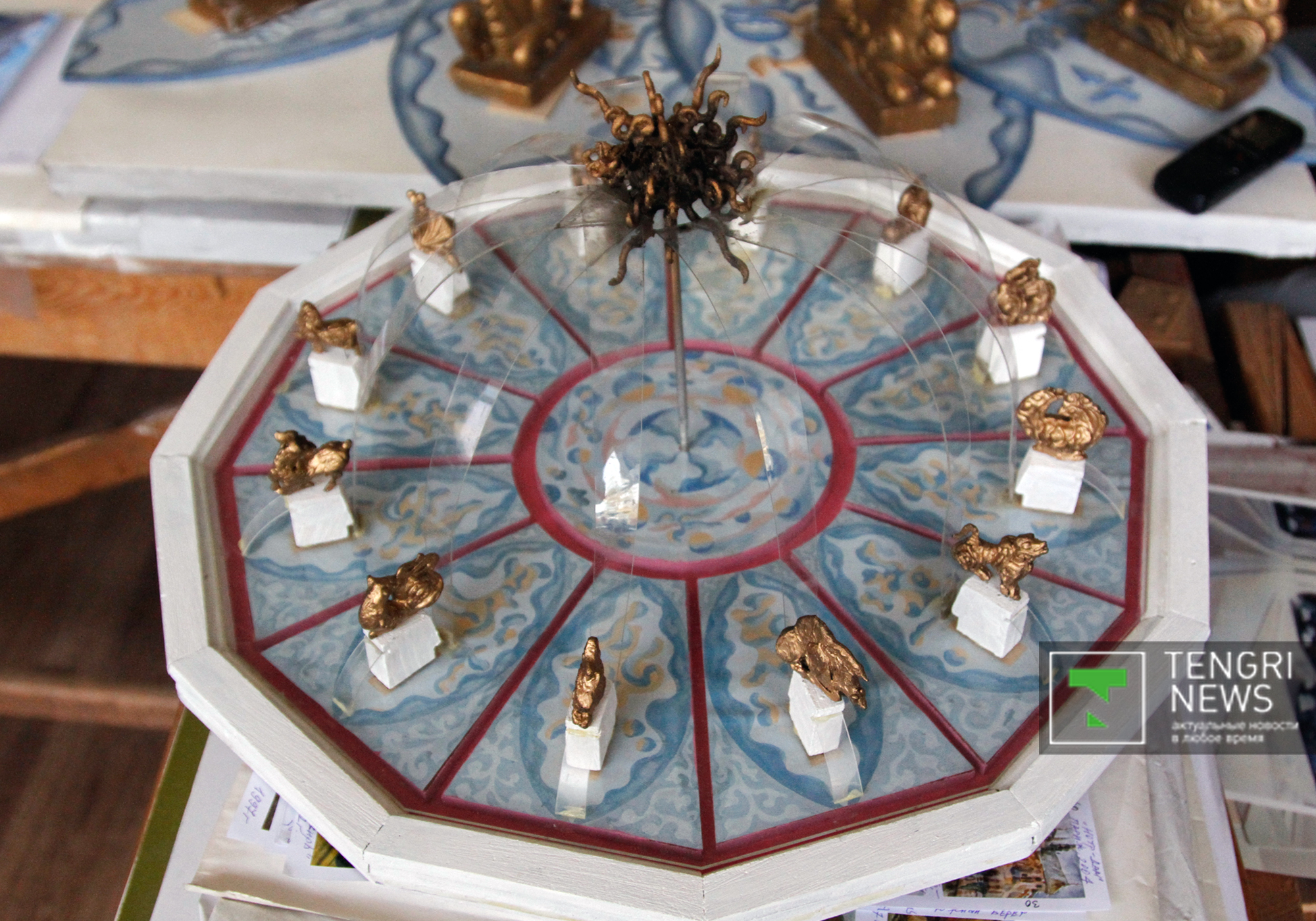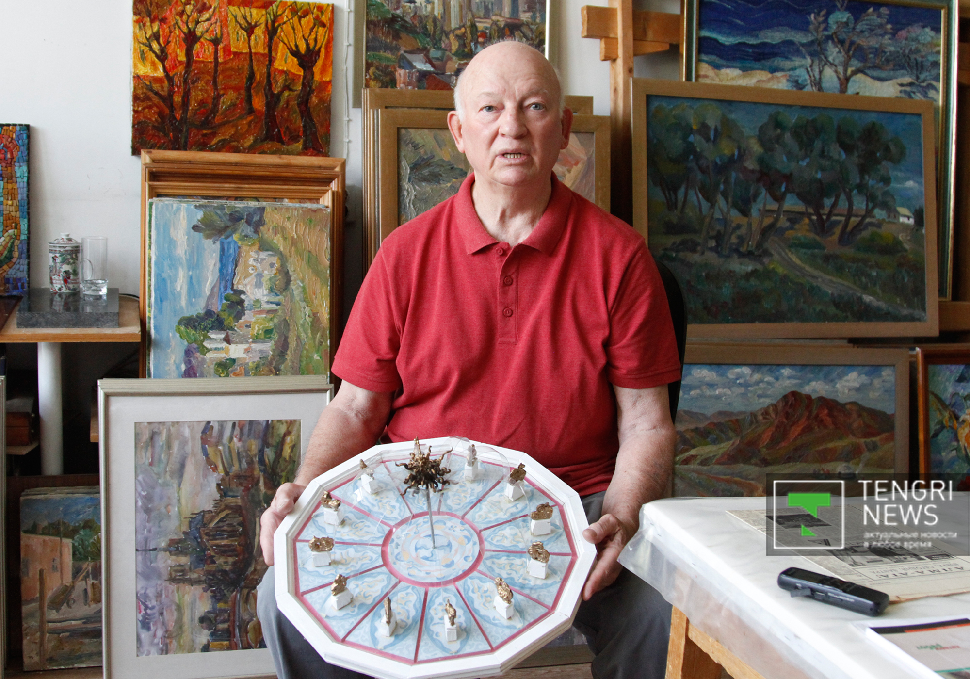 "Увидев Алма-Ату, я пришел в восторг. Такой чистый, зеленый, свежий город. Но фонтанов не было. И я предложил построить фонтан "12-годичный восточный календарь". В нем мне хотелось использовать звериный стиль искусства древних саков, скифов и других народностей, проживавших на территории нынешнего Казахстана. (...) По календарю годы начинаются с мышки, она и у меня стоит первая. Согласно легенде, мышка забралась на горб верблюда и первая увидела восходящее солнце, поэтому гороскоп начинается с нее. (...) Работа шла очень сложно. Отлить бронзу было негде. Все заводы были загружены, и к тому же материал-то был стратегический. Разрешение на работу с бронзой удалось получить на электро-механическом заводе в Алма-Ате. И хотя предприятие не было предназначено для таких тонких работ, получилось все на славу", - рассказал художник.
