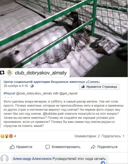 "Да, это страус. Но все животные в нормальном, естественном состоянии. У всех животных в клетках есть обогреватели, все были рады снегу. Я понимаю, что с человеческой точки зрения, когда начинают очеловечивать животных и приписывать им свои эмоции, ощущения, происходит приписывание несвойственных для животных чувств или ситуаций. Все животные живы, здоровы. Если хотите, могу вас провести, чтобы вы убедились своими глазами. Я полагаю, пост был опубликован с точки зрения человеческой эмпатии, которая абсолютно не относится к животным", - прокомментировала специалист по развитию парка "Кок-Тобе" Галия Калилаева.