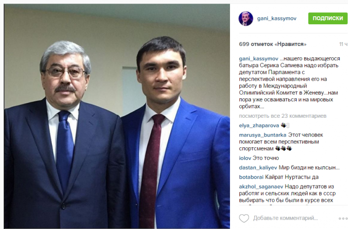 Кроме того, он считает, что ряды депутатов-спортсменов необходимо пополнить олимпийскими чемпионами Сериком Сапиевым...