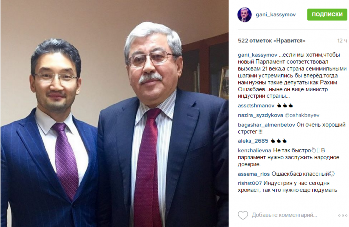 Среди кандидатур, которых отметил Гани Касымов, вице-министр по инвестициям и развитию Рахим Ошакбаев.