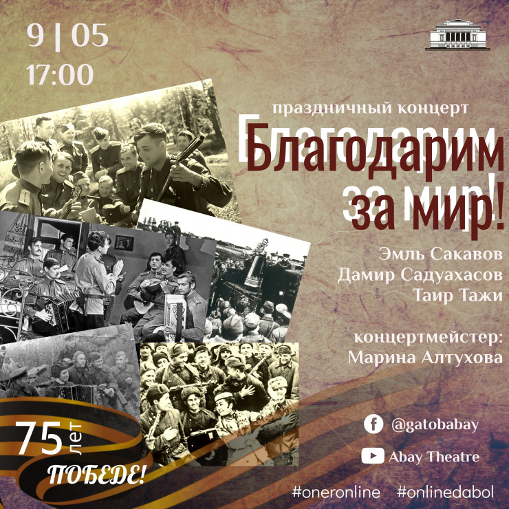 Вот и артисты театра Марина Алтухова, Таир Тажи (бас), Эмиль Сакавов (баритон), Дамир Садуахасов (тенор) к 75-й годовщине победы в Великой Отечественной войне выйдут в эфир с концертной программой "Благодарим за Мир!".